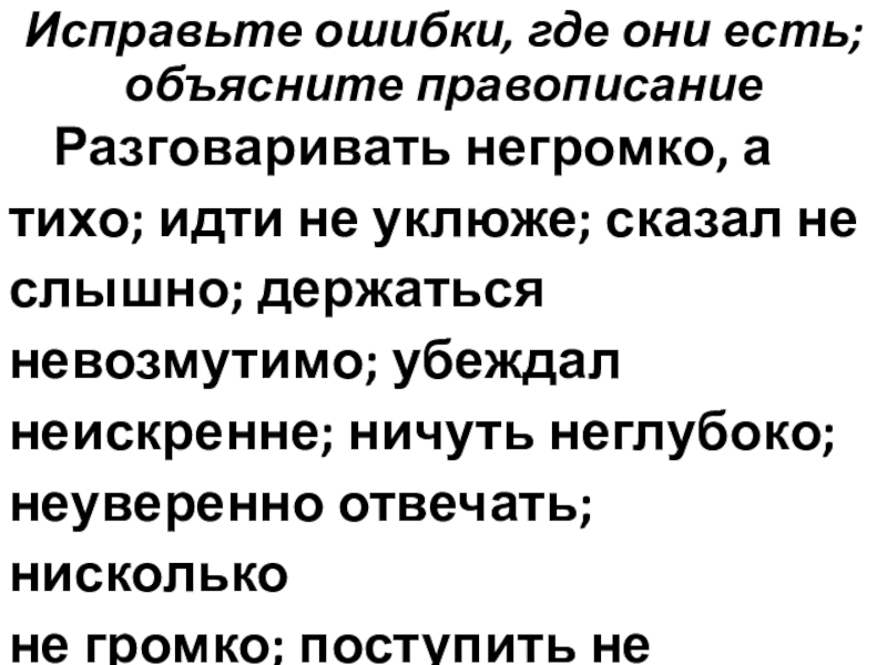 Исправьте ошибки, где они есть; объясните правописание	Разговаривать негромко, а тихо; идти не уклюже; сказал не слышно; держаться
