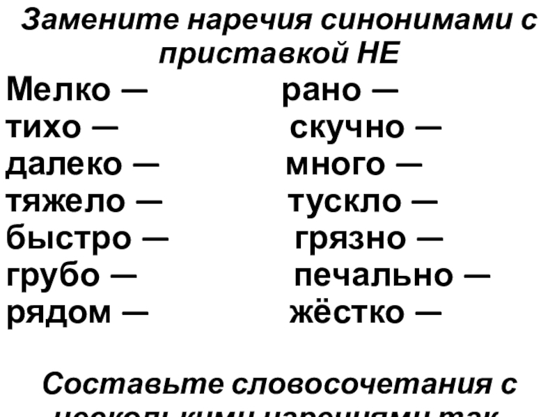 Слайд 3Замените наречия синонимами с приставкой НЕ