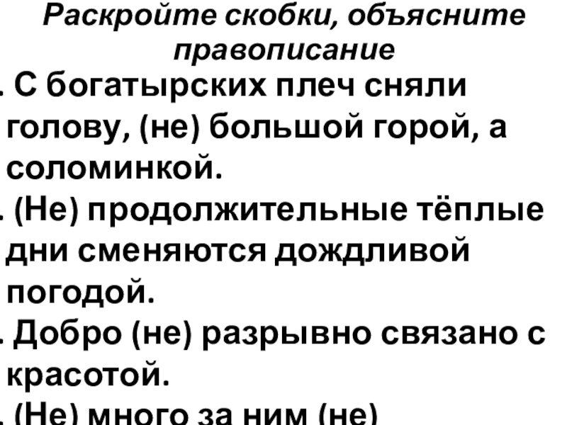 Раскройте скобки, объясните правописание С богатырских плеч сняли голову, (не) большой горой, а соломинкой. (Не) продолжительные тёплые