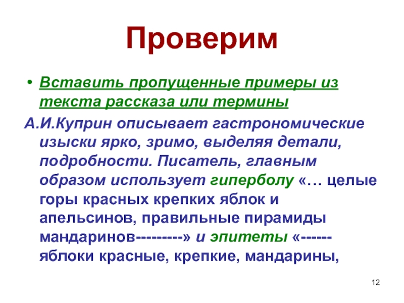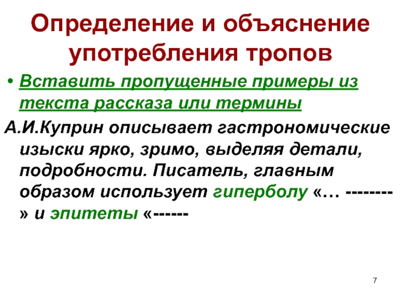А.И.Куприн описывает гастрономические изыски ярко, зримо, выделяя детали, подробности. Писатель, главным образом использует гиперболу «… --------» и эпитеты «------