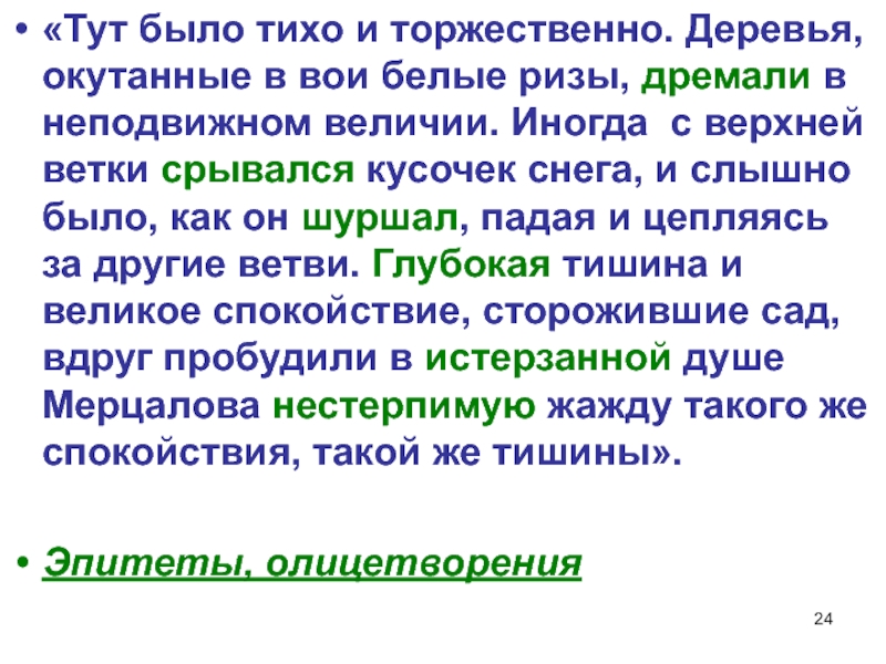 Слайд 24«Тут было тихо и торжественно. Деревья, окутанные в вои белые ризы,
