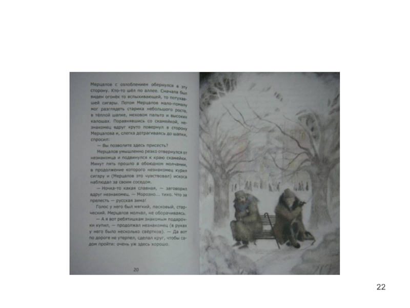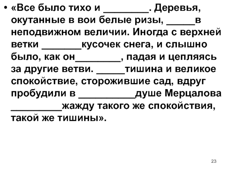 Слайд 23«Все было тихо и ________. Деревья, окутанные в вои белые ризы,