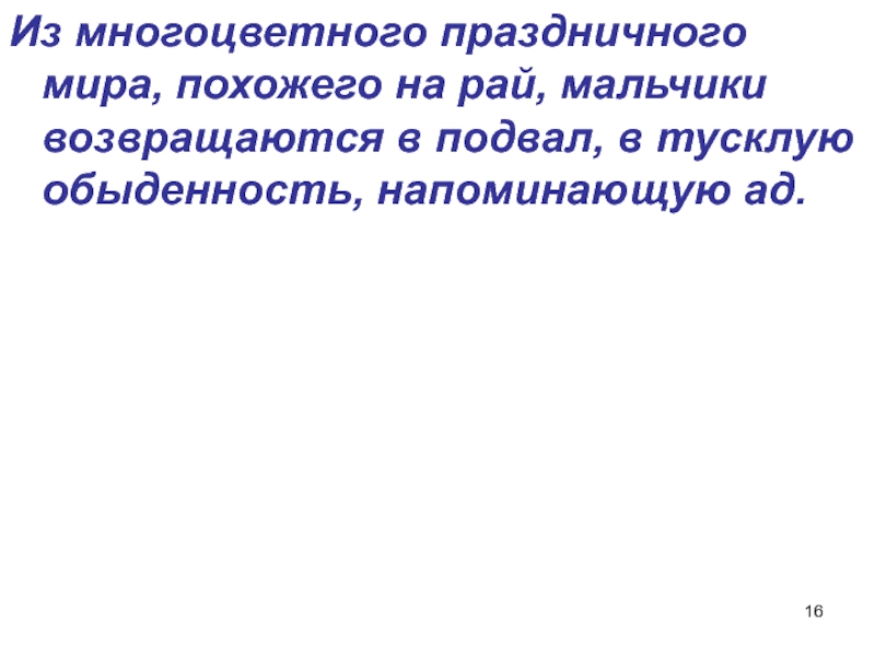 Слайд 16Из многоцветного праздничного мира, похожего на рай, мальчики возвращаются в подвал,