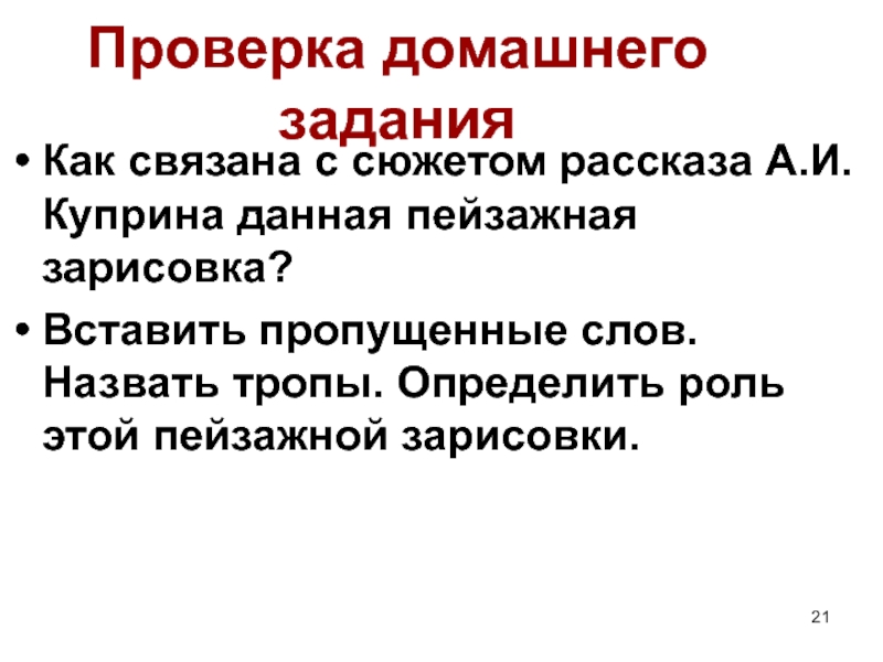 Вставить пропущенные слов. Назвать тропы. Определить роль этой пейзажной зарисовки.