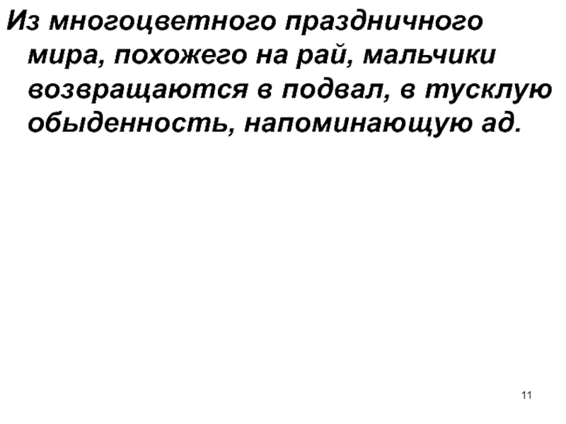 Слайд 11Из многоцветного праздничного мира, похожего на рай, мальчики возвращаются в подвал,