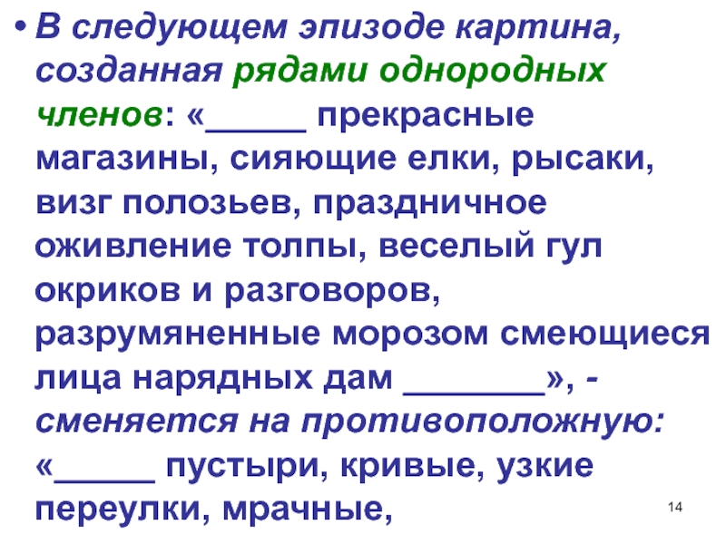 Слайд 14В следующем эпизоде картина, созданная рядами однородных членов: «_____ прекрасные магазины,