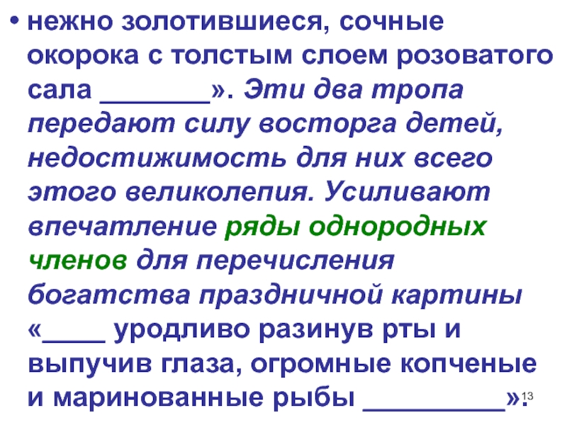 Слайд 13нежно золотившиеся, сочные окорока с толстым слоем розоватого сала _______». Эти