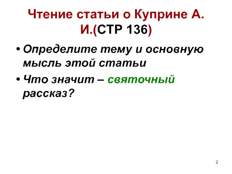 Слайд 2Чтение статьи о Куприне А.И.(СТР 136)