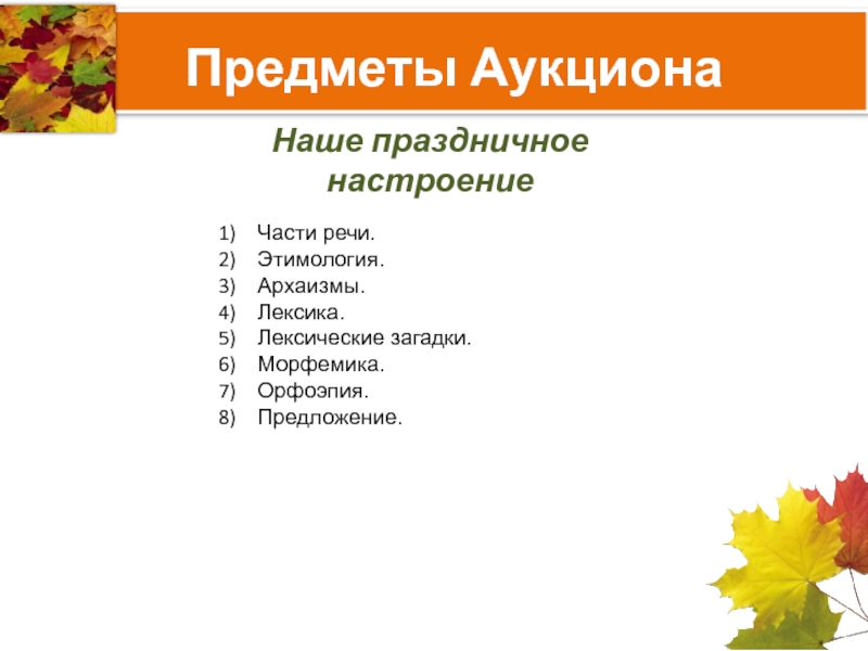 Предметы АукционаНаше праздничное настроениеЧасти речи. Этимология.Архаизмы.Лексика.Лексические загадки. Морфемика.Орфоэпия.Предложение.