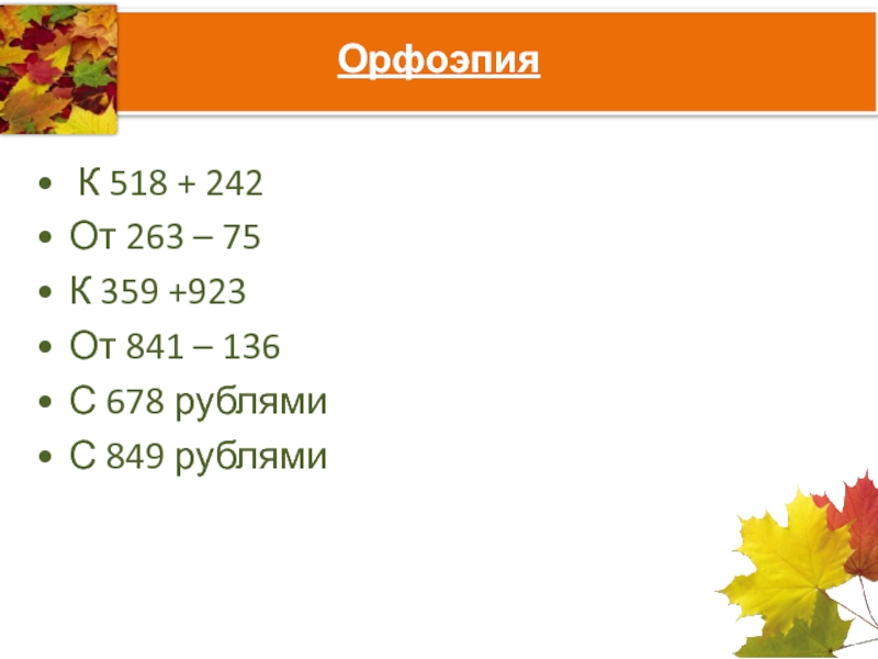 Орфоэпия К 518 + 242От 263 – 75К 359 +923От 841 – 136С 678 рублямиС 849 рублями