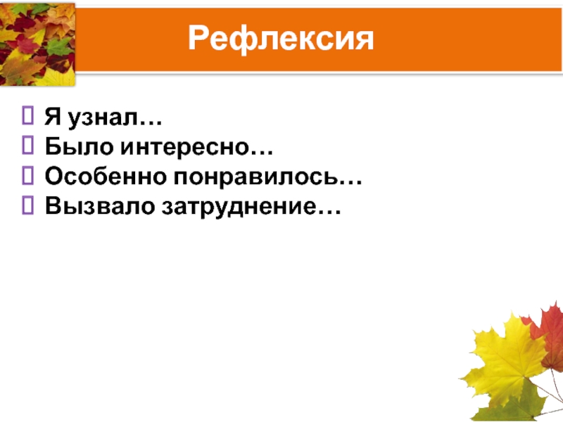 РефлексияЯ узнал…Было интересно…Особенно понравилось…Вызвало затруднение…