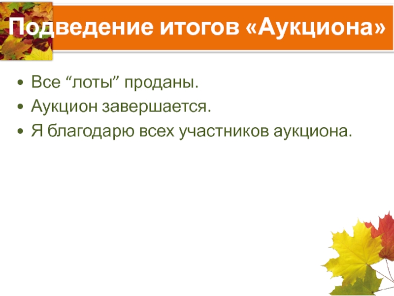 Подведение итогов «Аукциона»Все “лоты” проданы. Аукцион завершается.Я благодарю всех участников аукциона.