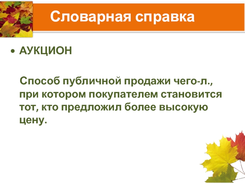 Словарная справкаАУКЦИОН     Способ публичной продажи чего-л., при котором покупателем становится тот, кто предложил