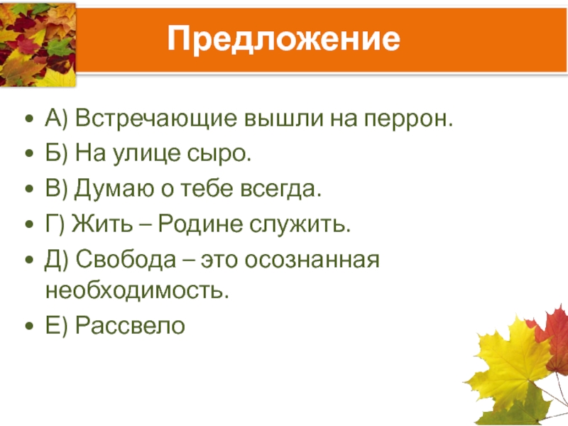 ПредложениеА) Встречающие вышли на перрон.Б) На улице сыро.В) Думаю о тебе всегда.Г) Жить – Родине служить.Д) Свобода