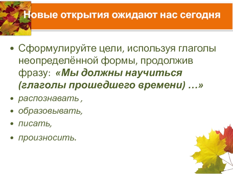 Новые открытия ожидают нас сегодняСформулируйте цели, используя глаголы неопределённой формы, продолжив фразу: «Мы должны научиться (глаголы прошедшего