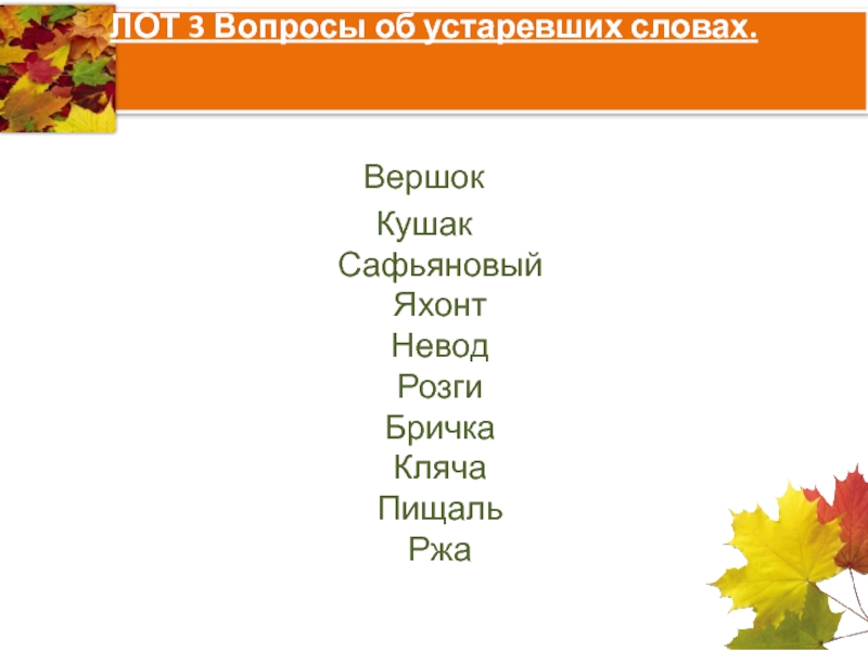 Слайд 10ЛОТ 3 Вопросы об устаревших словах.