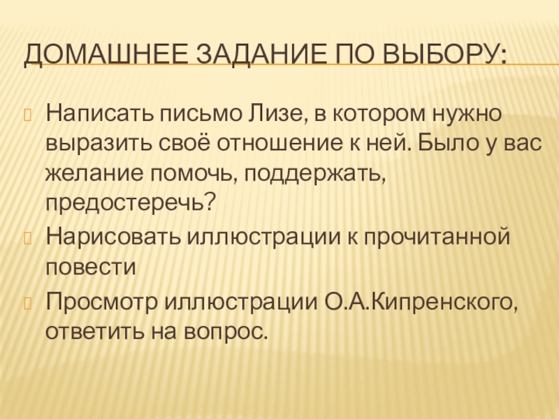 Домашнее задание по выбору:Написать письмо Лизе, в котором нужно выразить своё отношение к ней. Было у вас
