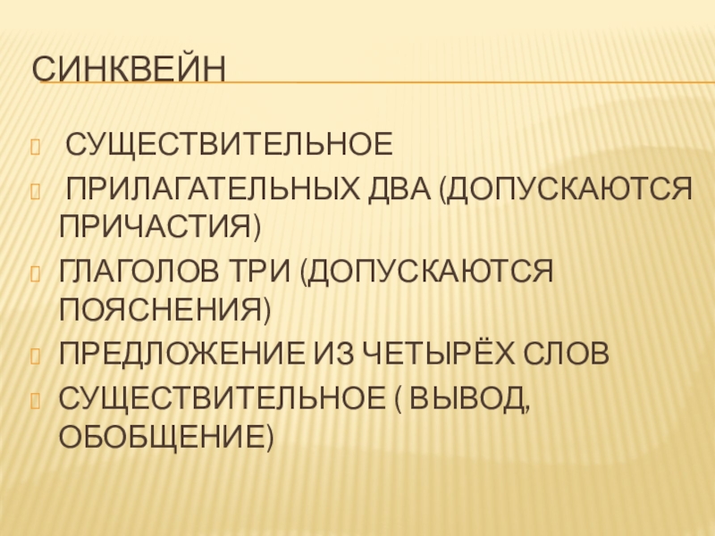 СИНКВЕЙН СУЩЕСТВИТЕЛЬНОЕ ПРИЛАГАТЕЛЬНЫХ ДВА (ДОПУСКАЮТСЯ ПРИЧАСТИЯ)ГЛАГОЛОВ ТРИ (ДОПУСКАЮТСЯ ПОЯСНЕНИЯ)ПРЕДЛОЖЕНИЕ ИЗ ЧЕТЫРЁХ СЛОВСУЩЕСТВИТЕЛЬНОЕ ( ВЫВОД, ОБОБЩЕНИЕ)