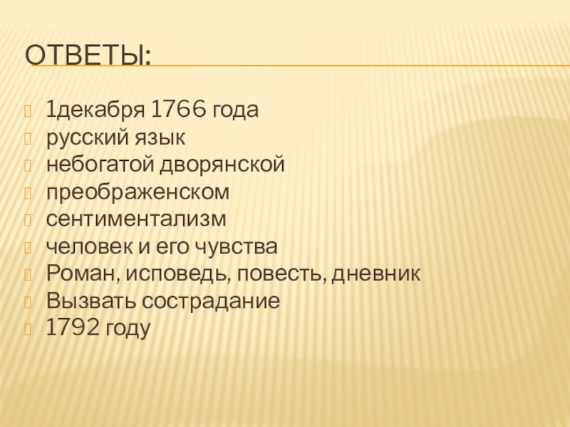 Ответы:1декабря 1766 годарусский языкнебогатой дворянскойпреображенскомсентиментализмчеловек и его чувстваРоман, исповедь, повесть, дневникВызвать сострадание1792 году
