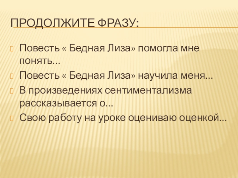 Продолжите фразу:Повесть « Бедная Лиза» помогла мне понять…Повесть « Бедная Лиза» научила меня…В произведениях сентиментализма рассказывается о…Свою