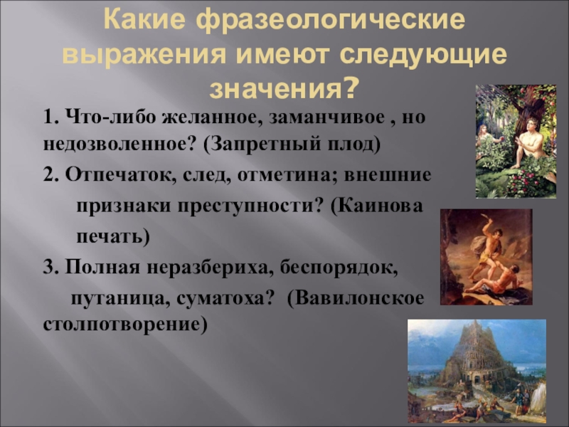 Какие фразеологические выражения имеют следующие значения?1. Что-либо желанное, заманчивое , но недозволенное? (Запретный плод)2. Отпечаток, след, отметина;