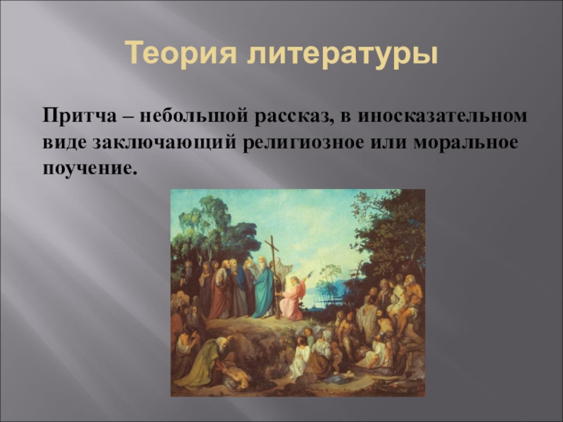 Теория литературыПритча – небольшой рассказ, в иносказательном виде заключающий религиозное или моральное поучение.