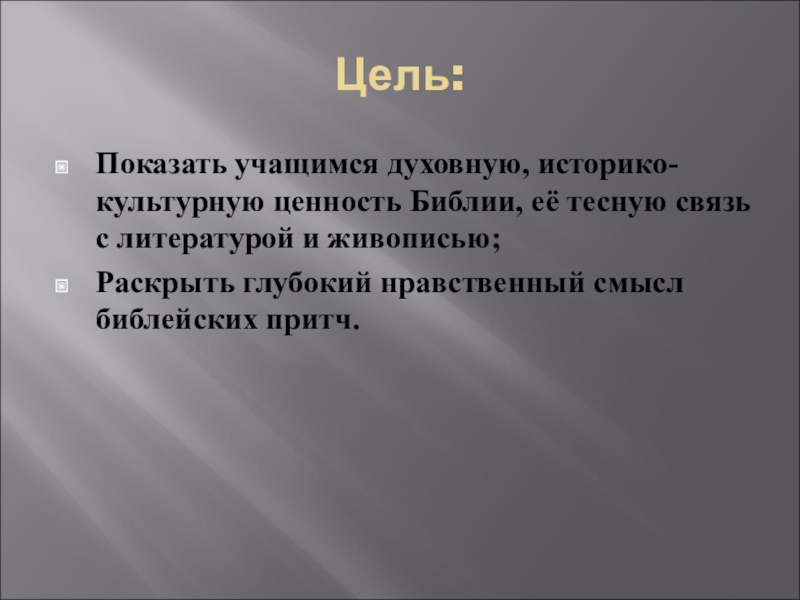 Цель:Показать учащимся духовную, историко-культурную ценность Библии, её тесную связь с литературой и живописью;Раскрыть глубокий нравственный смысл библейских притч.