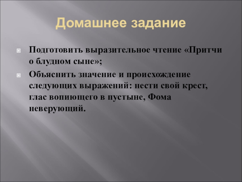 Домашнее заданиеПодготовить выразительное чтение «Притчи о блудном сыне»;Объяснить значение и происхождение следующих выражений: нести свой крест, глас