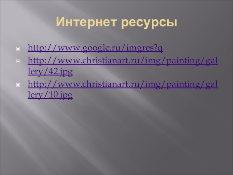 Интернет ресурсыhttp://www.google.ru/imgres?qhttp://www.christianart.ru/img/painting/gallery/42.jpghttp://www.christianart.ru/img/painting/gallery/10.jpg
