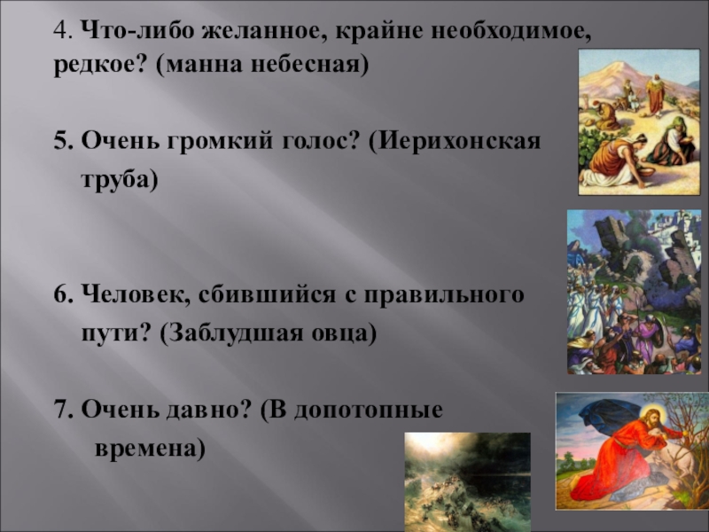 4. Что-либо желанное, крайне необходимое, редкое? (манна небесная)5. Очень громкий голос? (Иерихонская  труба)6. Человек, сбившийся с