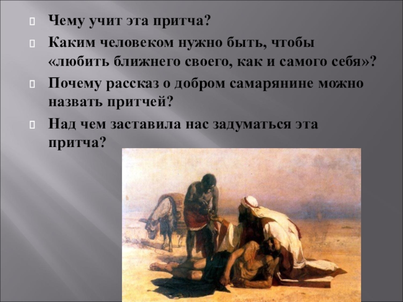 Чему учит эта притча?Каким человеком нужно быть, чтобы «любить ближнего своего, как и самого себя»?Почему рассказ о
