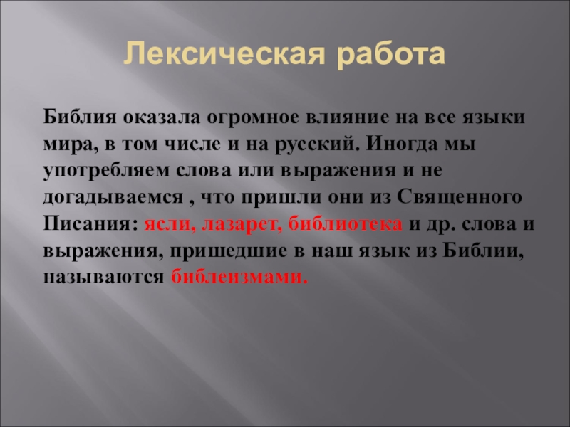 Лексическая работаБиблия оказала огромное влияние на все языки мира, в том числе и на русский. Иногда мы