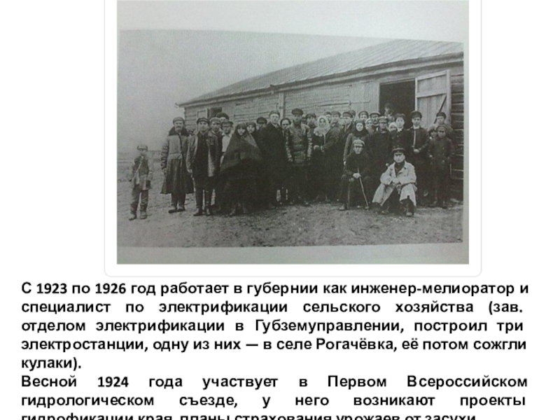 Слайд 5С 1923 по 1926 год работает в губернии как инженер-мелиоратор и