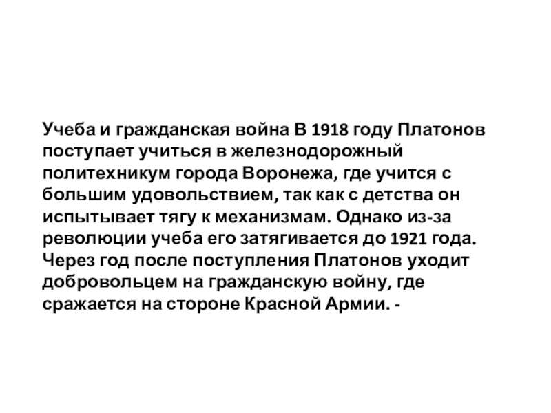 железнодорожный политехникум города Воронежа, где учится с большим удовольствием, так как с детства он испытывает тягу к механизмам. Однако из-за революции учеба его затягивается до 1921 года. Через год после поступления Платонов уходит добровольцем на гражданскую войну, где сражается на стороне Красной Армии. -
