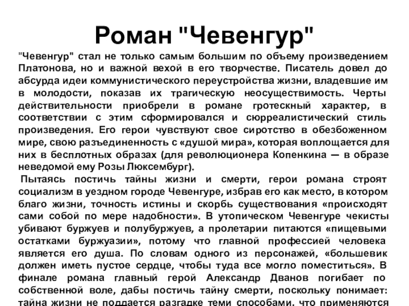 Платонова, но и важной вехой в его творчестве. Писатель довел до абсурда идеи коммунистического переустройства жизни, владевшие им в молодости, показав их трагическую неосуществимость. Черты действительности приобрели в романе гротескный характер, в соответствии с этим сформировался и сюрреалистический стиль произведения. Его герои чувствуют свое сиротство в обезбоженном мире, свою разъединенность с «душой мира», которая воплощается для них в бесплотных образах (для революционера Копенкина — в образе неведомой ему Розы Люксембург).