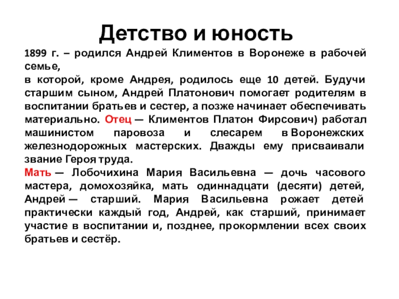 в которой, кроме Андрея, родилось еще 10 детей. Будучи старшим сыном, Андрей Платонович помогает родителям в воспитании братьев и сестер, а позже начинает обеспечивать материально. Отец — Климентов Платон Фирсович) работал машинистом паровоза и слесарем в Воронежских железнодорожных мастерских. Дважды ему присваивали звание Героя труда.