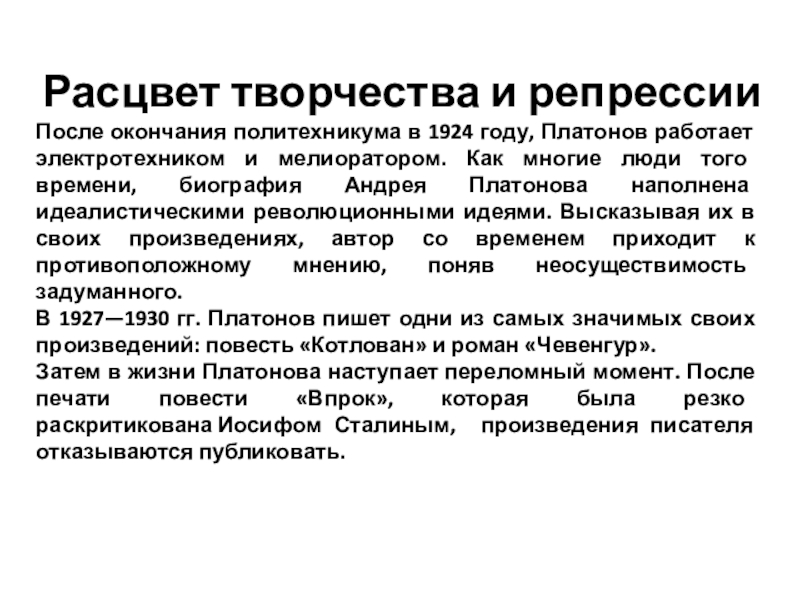 электротехником и мелиоратором. Как многие люди того времени, биография Андрея Платонова наполнена идеалистическими революционными идеями. Высказывая их в своих произведениях, автор со временем приходит к противоположному мнению, поняв неосуществимость задуманного.