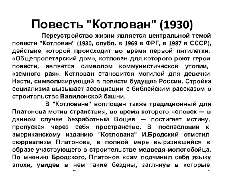 В 1927—1930 гг. Платонов пишет одни из самых значимых своих произведений: повесть «Котлован» и роман «Чевенгур».
