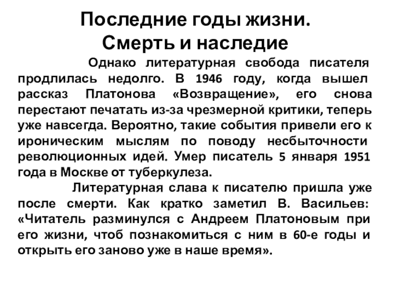 свобода писателя продлилась недолго. В 1946 году, когда вышел рассказ Платонова «Возвращение», его снова перестают печатать из-за чрезмерной критики, теперь уже навсегда. Вероятно, такие события привели его к ироническим мыслям по поводу несбыточности революционных идей. Умер писатель 5 января 1951 года в Москве от туберкулеза.