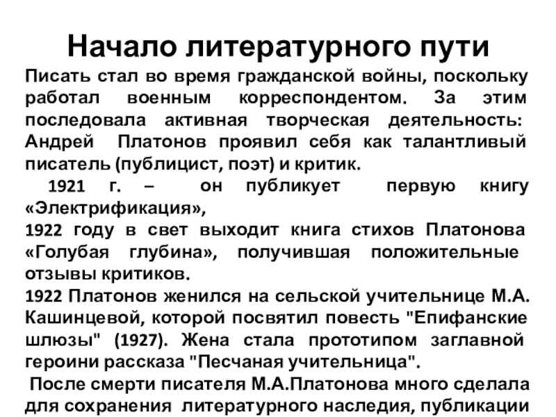 корреспондентом. За этим последовала активная творческая деятельность: Андрей Платонов проявил себя как талантливый писатель (публицист, поэт) и критик.