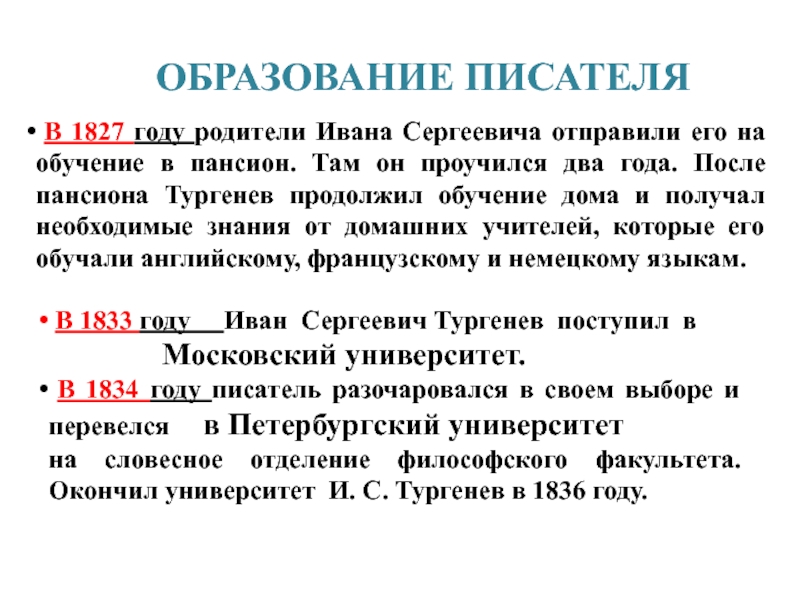 в пансион. Там он проучился два года. После пансиона Тургенев продолжил обучение дома и получал необходимые знания от домашних учителей, которые его обучали английскому, французскому и немецкому языкам.