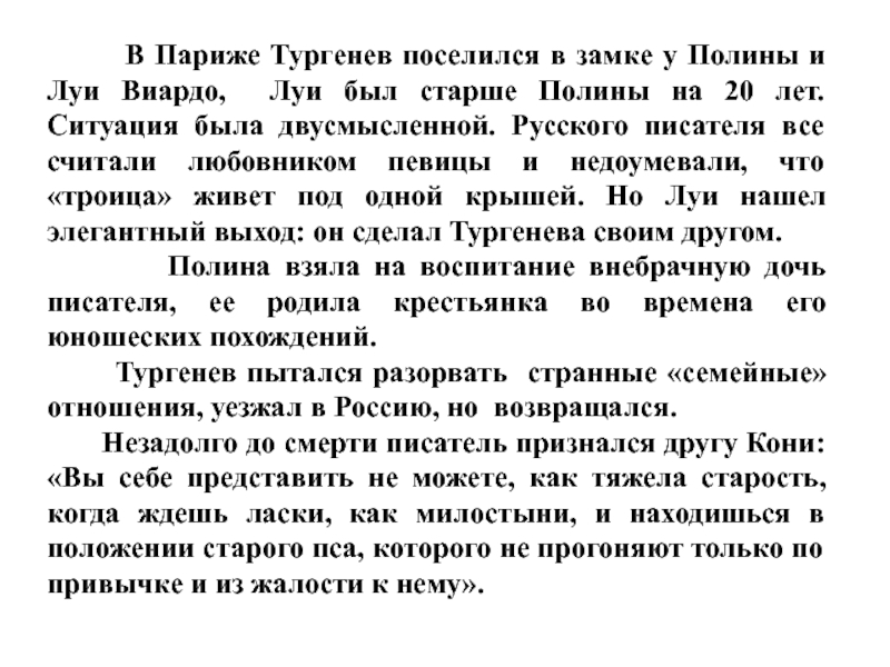 Полины и Луи Виардо, Луи был старше Полины на 20 лет. Ситуация была двусмысленной. Русского писателя все считали любовником певицы и недоумевали, что «троица» живет под одной крышей. Но Луи нашел элегантный выход: он сделал Тургенева своим другом.