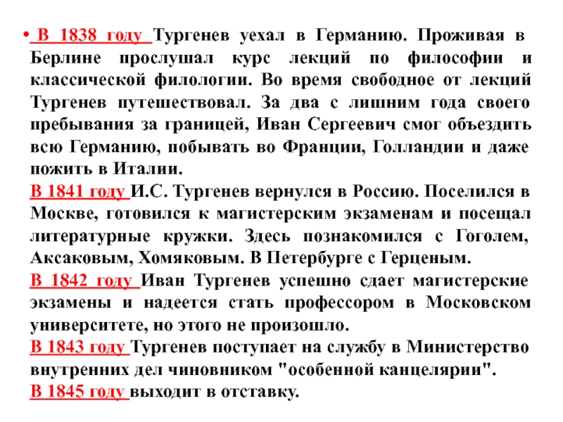 прослушал курс лекций по философии и классической филологии. Во время свободное от лекций Тургенев путешествовал. За два с лишним года своего пребывания за границей, Иван Сергеевич смог объездить всю Германию, побывать во Франции, Голландии и даже пожить в Италии.