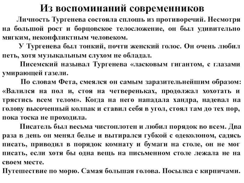 У Тургенева был тонкий, почти женский голос. Он очень любил петь, хотя музыкальным слухом не обладал.