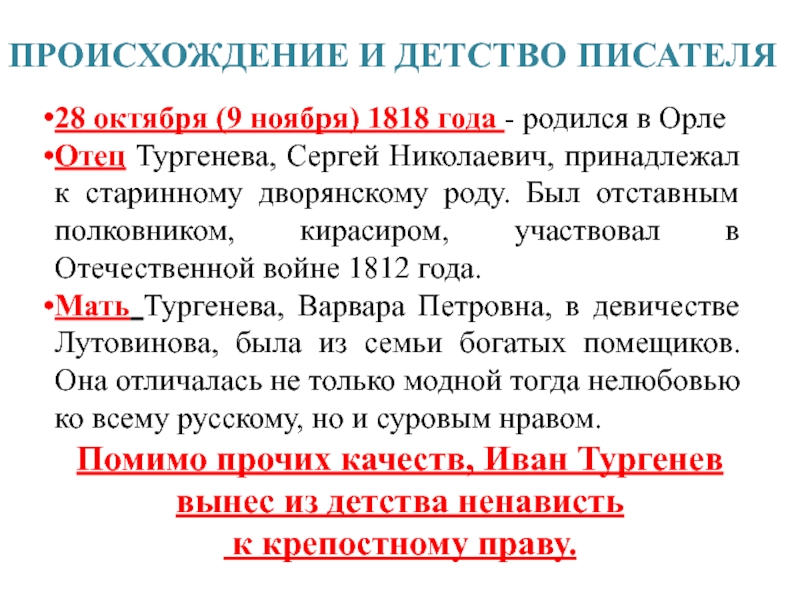 Мать Тургенева, Варвара Петровна, в девичестве Лутовинова, была из семьи богатых помещиков. Она отличалась не только модной тогда нелюбовью ко всему русскому, но и суровым нравом.