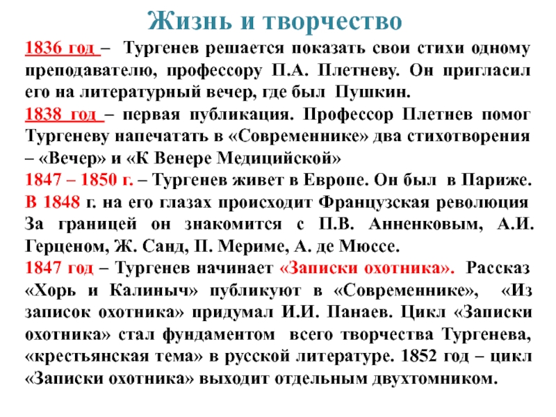 1847 год – Тургенев начинает «Записки охотника». Рассказ «Хорь и Калиныч» публикуют в «Современнике», «Из записок охотника» придумал И.И. Панаев. Цикл «Записки охотника» стал фундаментом всего творчества Тургенева, «крестьянская тема» в русской литературе. 1852 год – цикл «Записки охотника» выходит отдельным двухтомником.