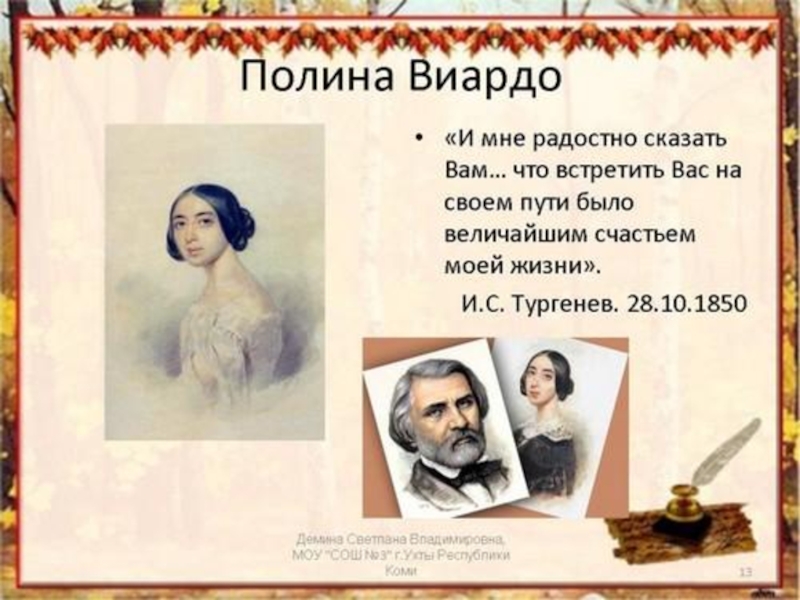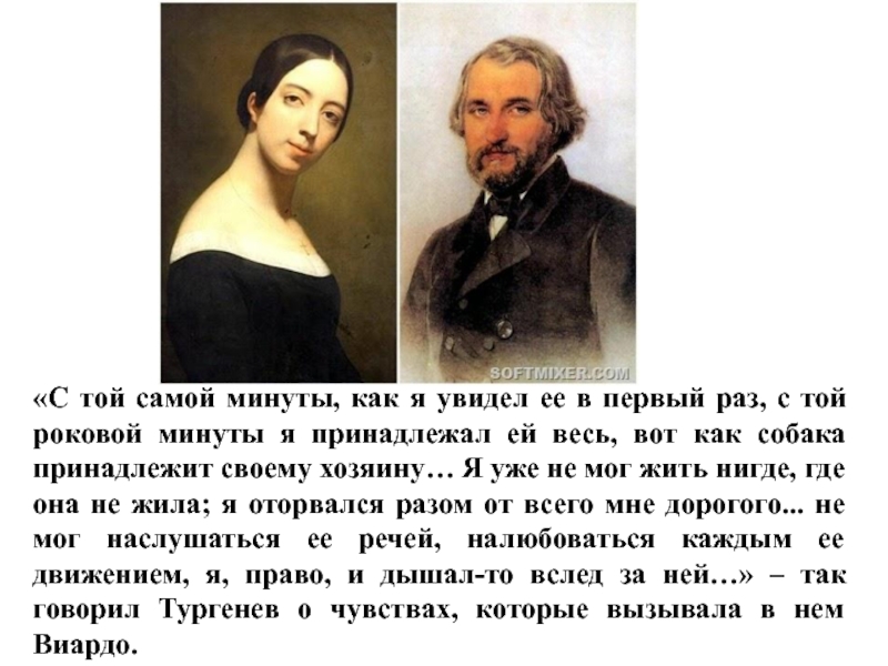 с той роковой минуты я принадлежал ей весь, вот как собака принадлежит своему хозяину… Я уже не мог жить нигде, где она не жила; я оторвался разом от всего мне дорогого... не мог наслушаться ее речей, налюбоваться каждым ее движением, я, право, и дышал-то вслед за ней…» – так говорил Тургенев о чувствах, которые вызывала в нем Виардо.