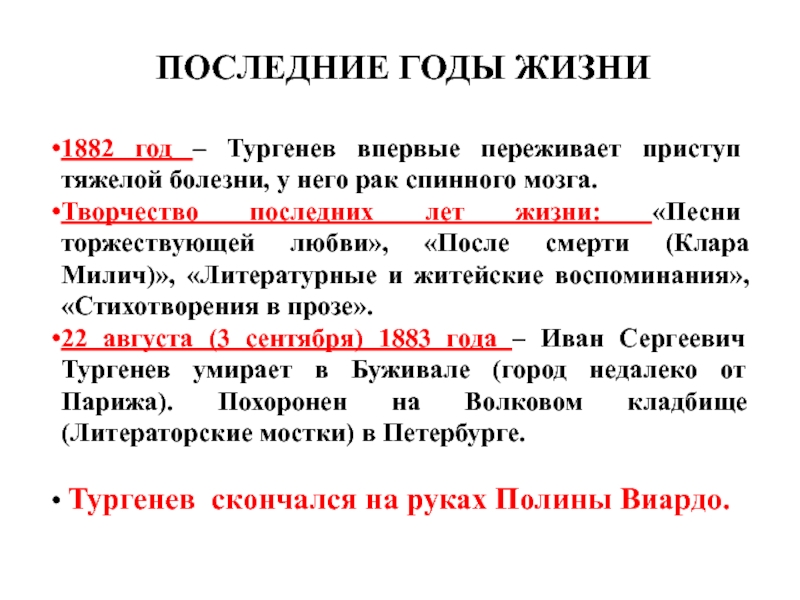 Творчество последних лет жизни: «Песни торжествующей любви», «После смерти (Клара Милич)», «Литературные и житейские воспоминания», «Стихотворения в прозе».