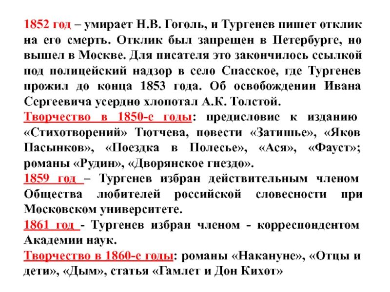 Творчество в 1850-е годы: предисловие к изданию «Стихотворений» Тютчева, повести «Затишье», «Яков Пасынков», «Поездка в Полесье», «Ася», «Фауст»; романы «Рудин», «Дворянское гнездо».