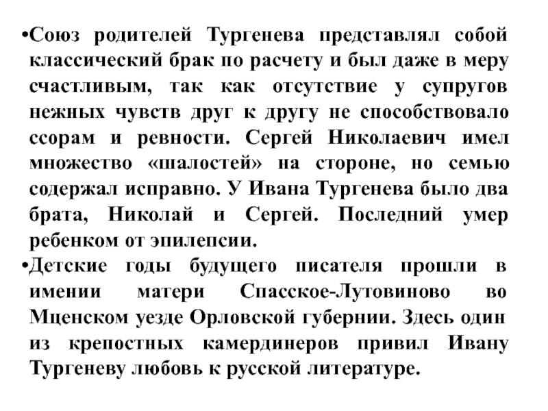 Союз родителей Тургенева представлял собой классический брак по расчету и был